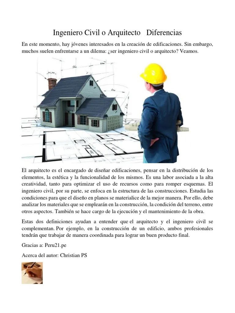 Si bien arquitectos e ingenieros civiles trabajan a la par en los proyectos, cabe destacar que el arquitecto se ocupa de crear diseños, diferentes tipos de planos de las obras y cumplen funciones de diseñador de interiores... Los ingenieros civiles se centran en cómo se construirán las cosas y la estructura de un edificio, mientras que los arquitectos aseguran que el diseño sea estéticamente … A esto voy a responder con una opinión personal: Si bien arquitectos e ingenieros civiles trabajan a la par en los proyectos, cabe destacar que el arquitecto se ocupa de crear diseños, diferentes tipos de planos de las obras y cumplen funciones de diseñador de interiores. No, un buen arquitecto debe enfocarse principalmente en resolver problemas, lo estético debe pasar siempre a segundo o … La ingeniería civil es la rama de la ingeniería que se encarga del diseño, la construcción y el mantenimiento de diferentes ….. Los ingenieros civiles se centran en cómo se construirán las cosas y la estructura de un edificio, mientras que los arquitectos aseguran que el diseño sea estéticamente …
