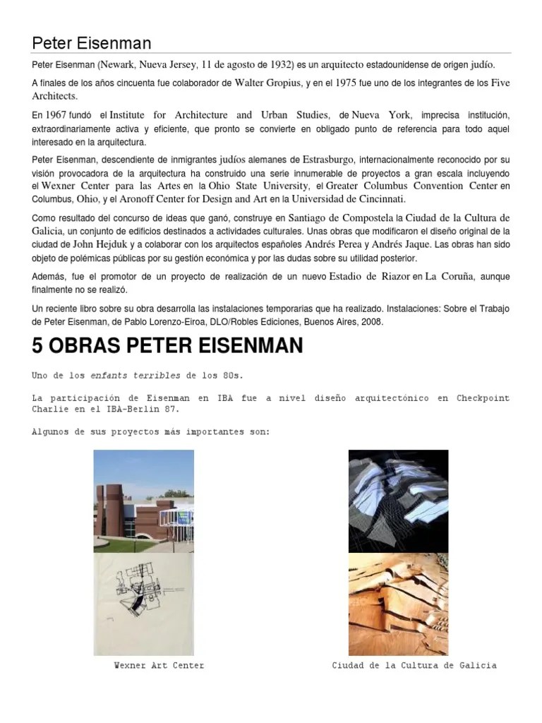 Peter eisenman es un arquitecto y educador reconocido internacionalmente cuyos galardonados proyectos de vivienda y diseño urbano a gran escala , instalaciones innovadoras para instituciones educativas y una serie de ingeniosas casas … Internationally acclaimed architect peter eisenman established his professional practice in 1980.