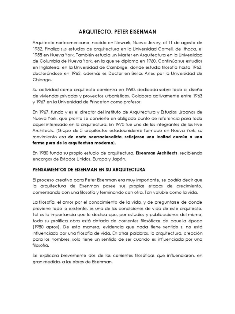 Luego asistió a la universidad de columbia, nueva york para obtener su maestría, que recibió en 1960... Share on facebook share on twitter pinterest google+ email. Peter eisenman es un arquitecto y educador reconocido internacionalmente cuyos galardonados proyectos de vivienda y diseño urbano a gran escala , instalaciones innovadoras para instituciones educativas y una serie de ingeniosas casas …